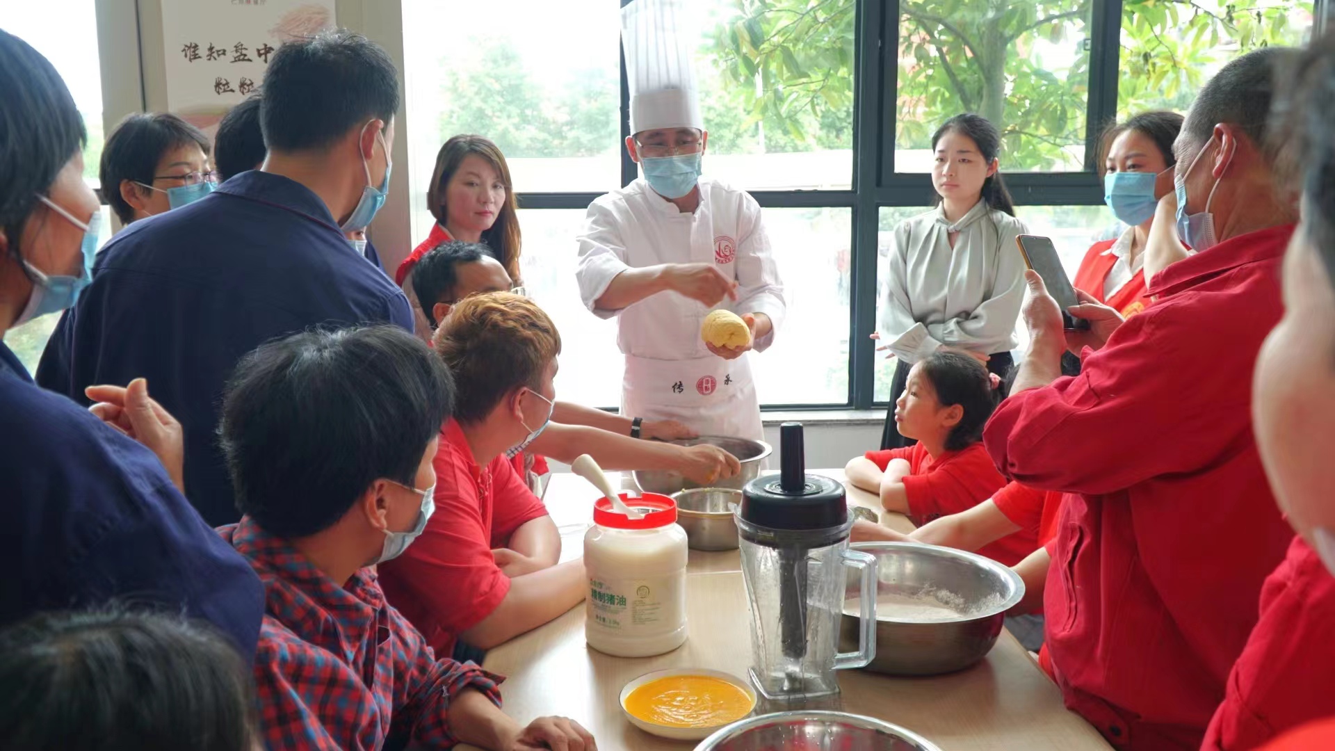 6月11日,浙江康盛股份有限公司的职工食堂内,职工们正围着远道而来的技能大师请教面点制作窍门。这些技能大师不是别人,正是浙江工会助力山区26县高质量发展劳模工匠志愿服务队的队员们。这一天他们专程赶来淳安,上门为近百名残疾人职工送来定制服务。
