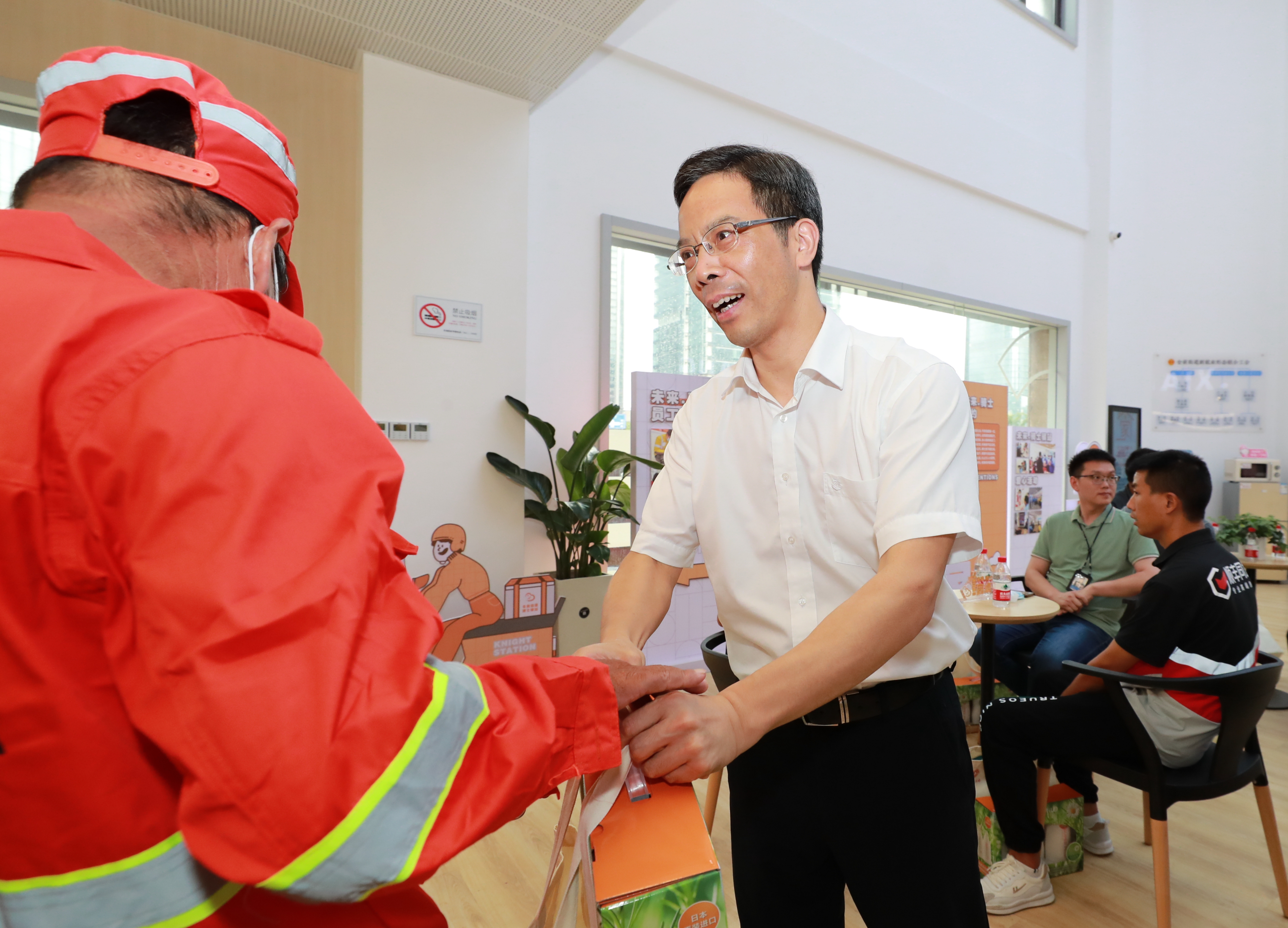 “你是哪里人?在这一行干多久了?有什么需要工会帮助的地方?”在慰问现场,吕志良与几名正好前来小哥驿站歇脚的户外劳动者亲切地攀谈起来,他们中有来自顺丰、韵达的快递员,也有来自饿了么的外卖配送员。大家围坐在一起,虽然身着不同颜色的制服,但劳动的热情都是一样的,吕志良耐心地向大家讲解了加入工会组织的重要意义。听到加入工会好处多多,在场还未入会的户外劳动者们纷纷拿起手机现场扫码一键入会。吕志良还亲切地询问了他们的劳动强度、收入水平以及权益保障情况,聆听了他们对工会服务提出的意见和建议,并深情嘱咐他们在高温天气要做好防暑降温和安全生产工作。就大家普遍关注的社会保障及子女入托等问题,吕志良回应,下一步会积极争取党政相关部门的大力支持,工会做好全力配合,大家一起努力,帮助解决职工群众的“急难愁盼”。