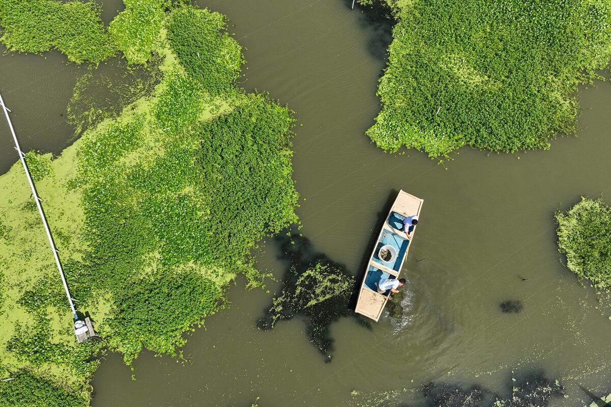 9月19日,在湖州市吴兴区织里镇汤溇村的一处大闸蟹养殖基地,养殖户正在捕捞大闸蟹。
