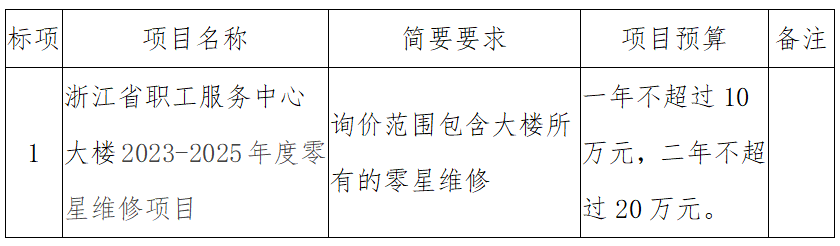 浙江省职工服务中心大楼2023-2025年度零星维修项目进行询价采购,现请符合条件的中华人民共和国境内的潜在投标人前来报名投标。