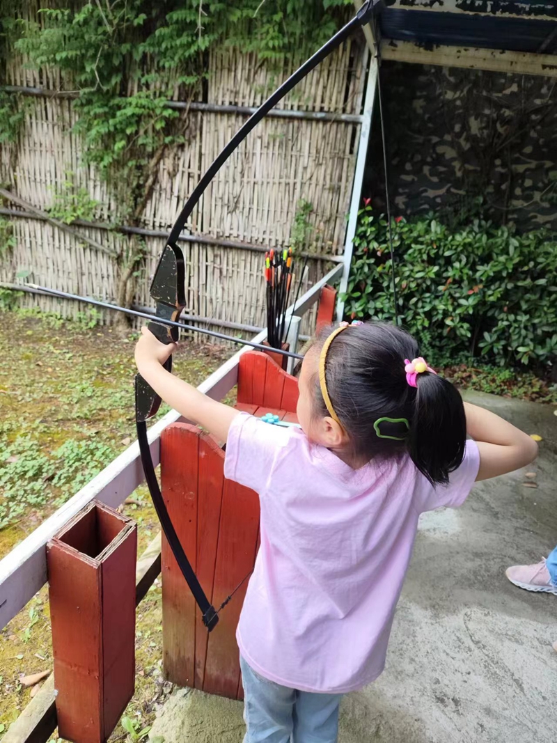 下午的活动也很精彩,在靶场孩子们体检了一把当神箭手的快乐,左手握着弓,箭搭上弦,右手捏着箭,小手用力拉开弦,眼神专注地瞄着靶,右手一松开,“嗖”,箭离弦直奔靶心。