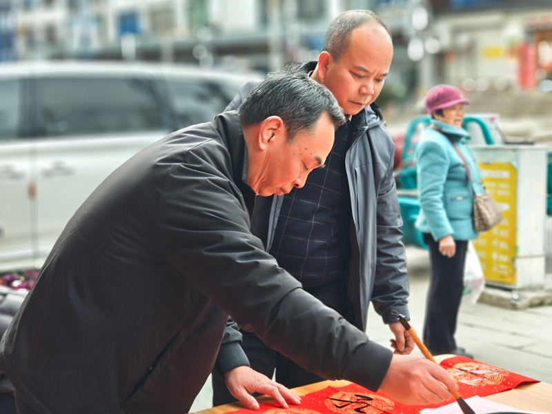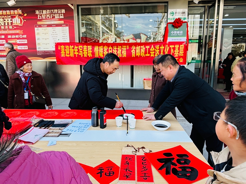 临近春节以来,为助力邮政代理金融业务发展,赋能基层网点开业,省邮政书法协会陈先良、王敏、徐光辉三位书法老师根据省邮政工会统一安排,奔赴衢州及下辖各县(市)分公司开展”送文化下网点“活动,他们分别到开化解放路营业所、常山溪口营业所、衢州石梁及荷花营业所、龙游大众所五个网点为客户现场书写对联、福字,为营业所带来了一场别开生面的艺术盛宴。