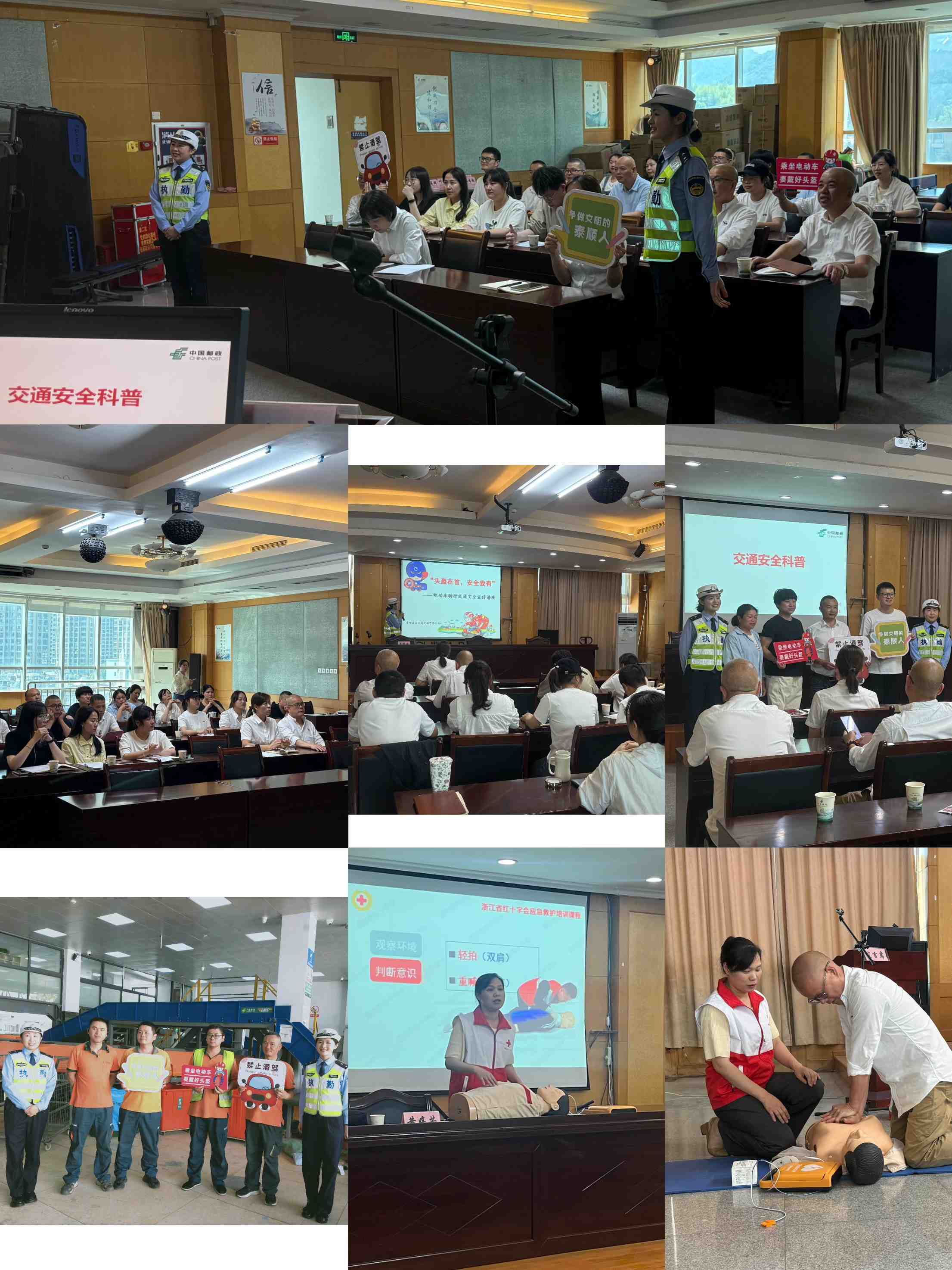 为提升员工的安全意识和应对突发事件的能力,5月14日,泰顺县邮政工会联合安保部门邀请泰顺县总工会、泰顺县交警队、泰顺县红十字会等单位为全体员工开展交通安全科普、心肺复苏等应急救护的培训,共计40余人参与。