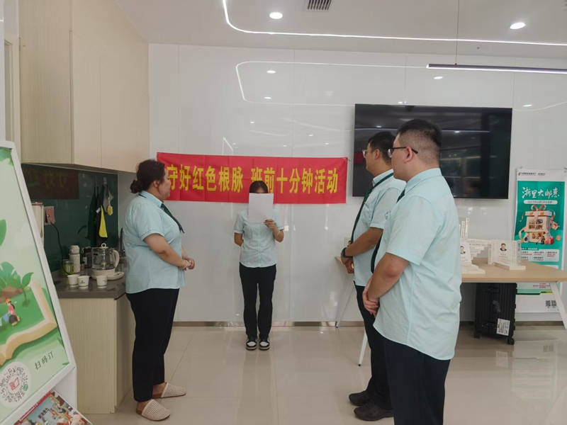 8月29日,景宁县分公司城南营业所开展8月“守好红色根脉·班前十分钟”宣讲活动,本期宣讲人为城南营业所理财经理蓝晶瑶。
