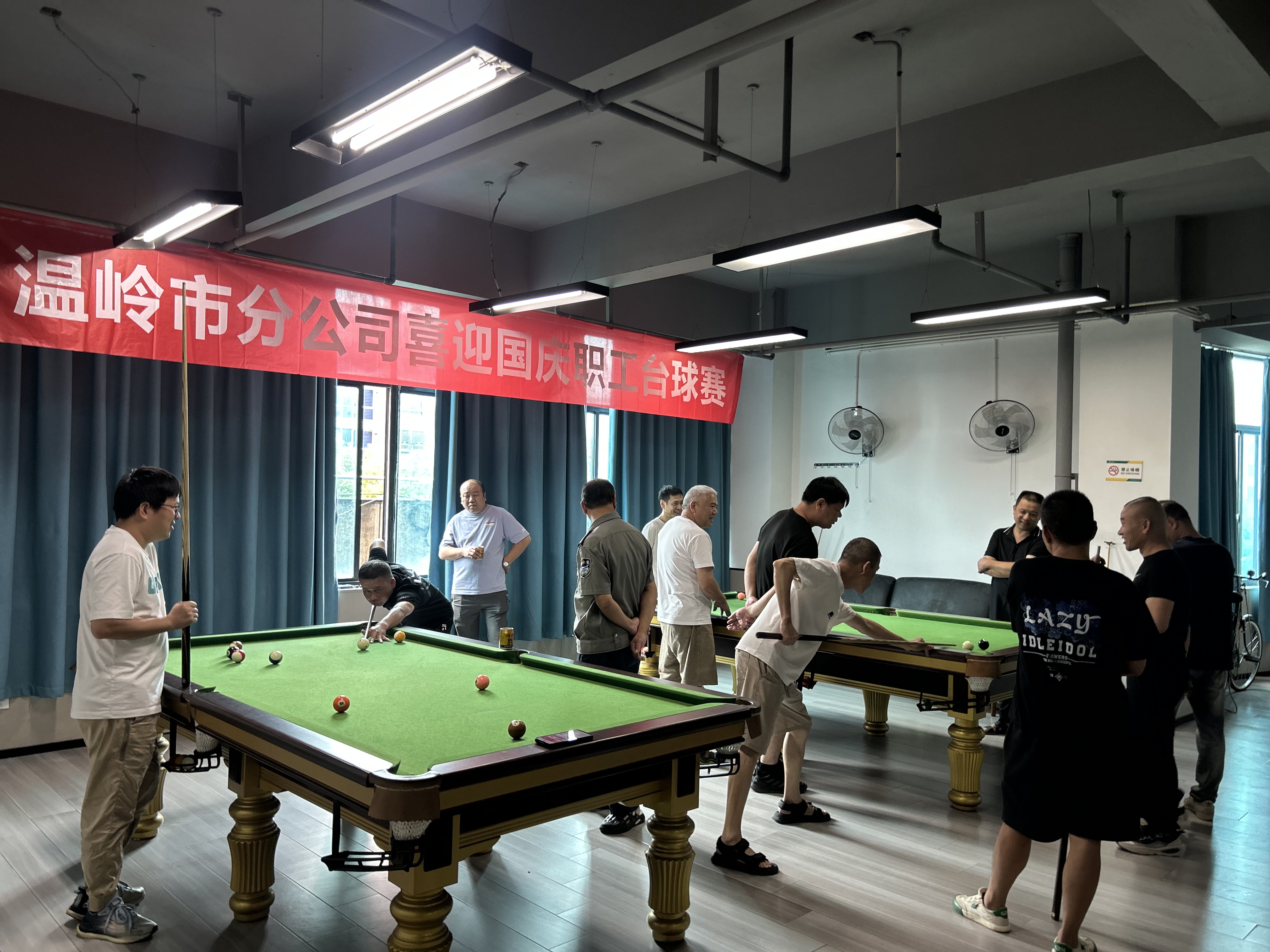 为喜迎国庆佳节,丰富职工文化生活,增强团队凝聚力,9月23日中午,温岭市分公司职工台球赛在公司活动室圆满举办,来自各部门的12名台球爱好者齐聚赛场,以精湛球技共庆祖国华诞。