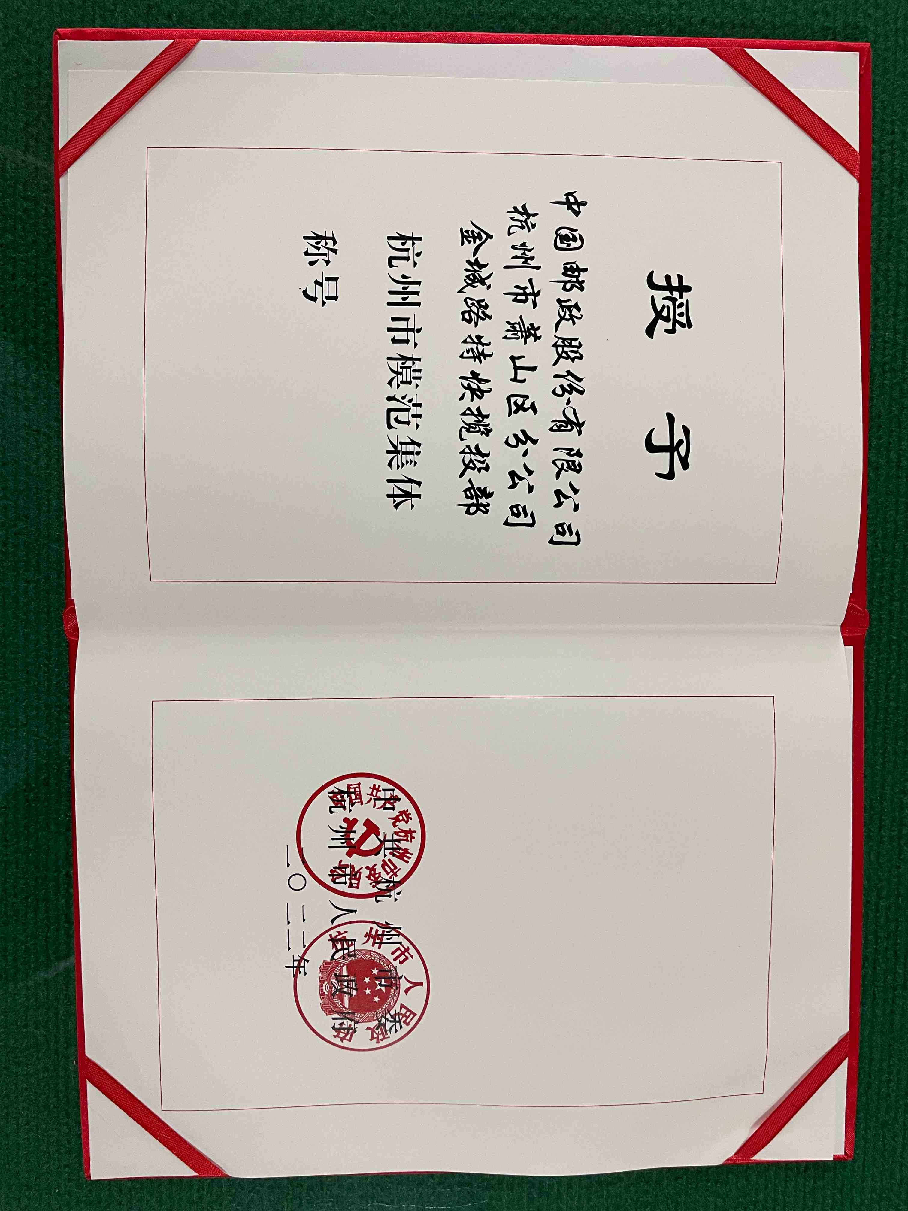 近日,萧山区邮政分公司金城路特快揽投部被杭州市人民政府授予“杭州市模范集体”。