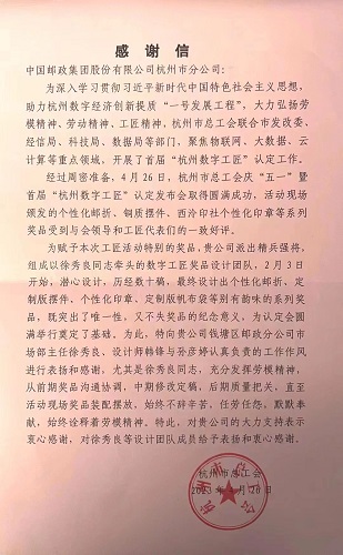 4月28日下午,杭州市总工会向中国邮政集团有限公司杭州市分公司发来《感谢信》,对杭州邮政钱塘区分公司市场部主任徐秀良,集邮与文化传媒部数字工匠设计团队成员韩锋、孙彦婷,在数字工匠奖品项目上的设计和服务给予高度认可,向杭州邮政表示衷心感谢。