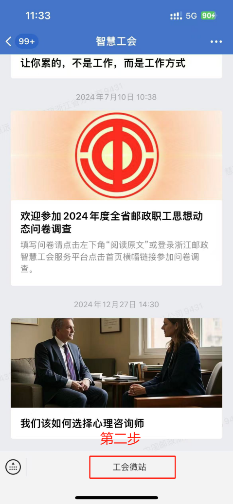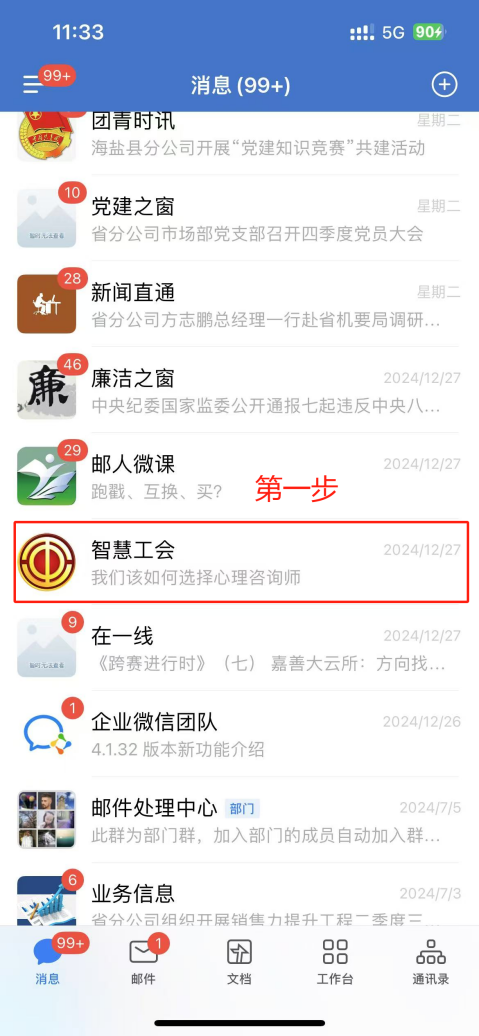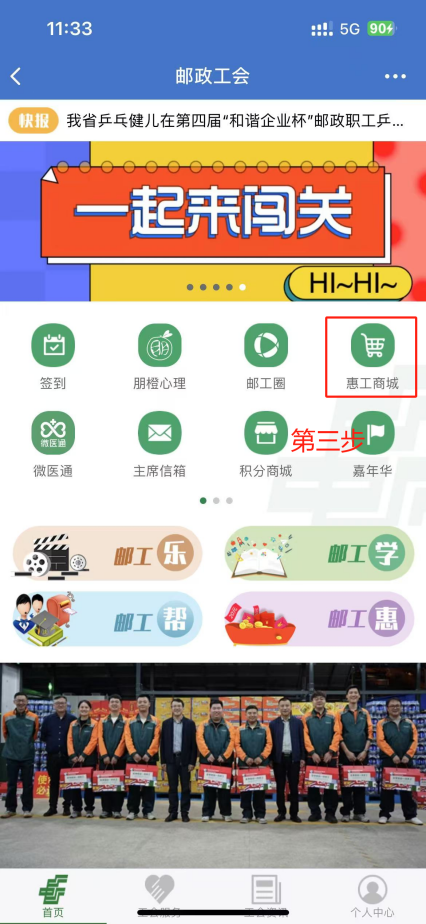 方式二,在企微进入:第一步在工作台或者消息页面,找到【智慧工会】,点击进入消息界面;第二步,点击下方的【工会微站】进入邮政工会界面;第三步,点击【惠工商城】进入商城首页。