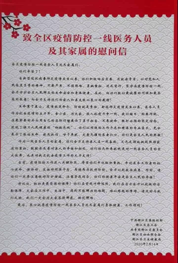 “这是暖心服务卡,您的儿子在抗疫一线,我们就是你的坚强保障,上面有我们的联系方式,若有什么需求,尽管联系我。”听了杜慧红副主席的介绍,区疾控中心方李奇的妈妈表示,“感谢你们对我们家属的关心关爱,我们会全力配合疫情防控工作,照顾好家人,让他全身心投入工作,齐心协力共同战胜疫情。”