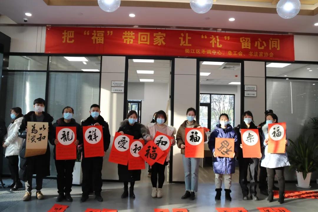 春节即将来临,年味越来越浓,为弘扬中华传统文化,营造喜庆、祥和的节日氛围,衢江区总工会特邀衢江区书法家协会的5位老师走进衢江区矛盾调解中心(职工服务中心),开展“把福带回家 让礼留心间”新春送福公益活动,为职工群众送上了新年第一份美好的祝福,同庆幸福中国年。