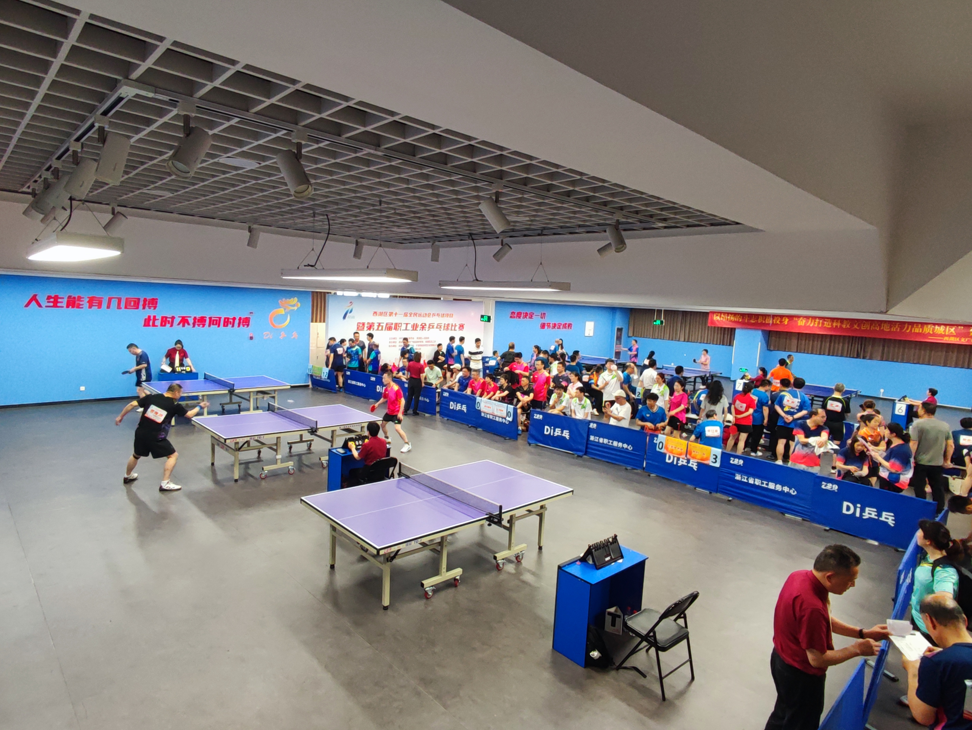 5月18日-5月19日,浙江省职工服务中心三楼和五楼格外热闹,加油声、呐喊声此起彼伏,杭州西湖区第十一届全民运动会乒乓球项目暨第五届职工业余乒乓球比赛在这里举行。