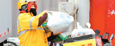 日前,河北固安县开展便民线上生活必需品订购服务,实行网上下单和无接触配送。图为外卖小哥在固安县给顾客送货。(新华社发)