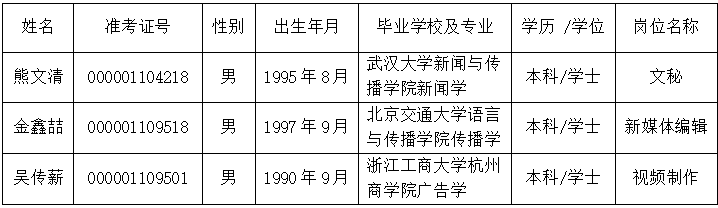 根据2021年8月23日《浙江省总工会所属事业单位公开招聘人员公告》规定的条件和程序,经过公开报名、资格审查、考试、体检和考察,经省总工会党组研究同意,浙江工人日报社确定拟聘用人员,现公示如下: